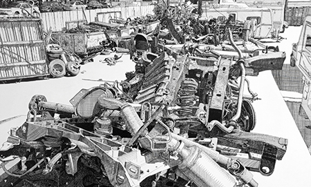 Ichiro Irie’s alliteratively titled "Garmonbozia Sagrada" presents work from two, perhaps three bodies of work, but it’s worth it just to see "Impermanence 2" alone, a large scale drawing using black “permanent marker” on bright white canvas. “Permanent” is in quotes because the marker will fade over time, the car junkyard depicted will therefore gradually disappear. The stunt aspect of that work aside, it’s a beautifully rendered image: Irie cross-hatches his pen with incredible deftness, producing an effect that is visceral up close and photographic at a distance. It's a specific style of wide, cross-hatched rendering on a large scale that I’ve never seen. While that work steals the show, that does not take away from his impressive "Imposter Series," in which iconic movies are referenced in black-and-white poster putty on panels, the most recognizable being the penis-and-balls sculpture from "A Clockwork Orange" (titled “Alex”). It's one of the greatest clashes between benign, classical chiaroscuro rendering and its very non-benign object you’ll ever see. “Love” and “Hate” are four-knuckle rings that Radio Raheem wore in "Do the Right Thing." A grouping of six smaller, vertically-oriented putty-on-panel pieces, also from "The Imposter Series," are graphically flat and more enigmatic in terms of their sources (religion, cults). But they make a nice counterpoint to the large, masterful drawing and its two small pen-on-paper offspring.