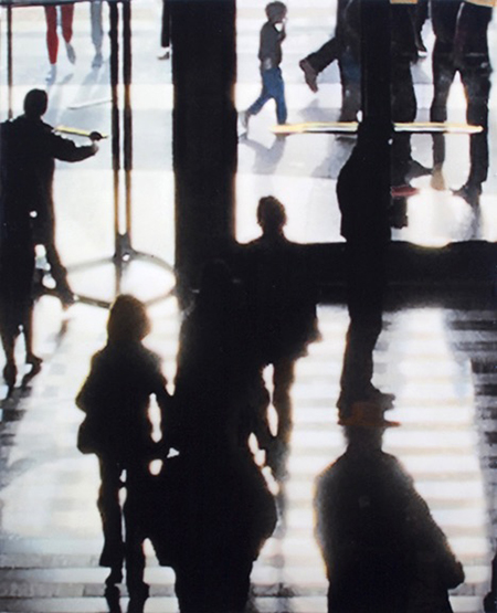 Sherry Karver is a chronicler of humanity, both visually and through the intricate text that she writes onto her photo-collages. Looking at her depictions of crowd scenes, created with photography, painting, digital alteration and resin, and spending time reading her detailed texts, revealing the presumed inner thoughts of her characters, can feel deliciously voyeuristic. Karver, who titles this exhibition “True Story” is also a traveler and people watcher, spending long hours in train stations, shopping centers and museums throughout the U.S. and foreign capitals. While observing crowds of often self-obsessed individuals, she takes black and white photos of them, which become primary source material. She alters the photos, adding color, details and shadows, and blurring some images. She then overlays detailed, handwritten texts onto the individuals' bodies, revealing their supposed inner thoughts.