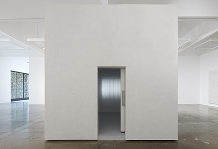 Corse's installation succeeds in part because of its minimalist structure. A cubic 12 x 12 x 12 foot chamber is painted white inside and out. "The Cold Room" is a sparse space that viewers enter by opening a door and then closing it once inside. Free from distractions, we are able to engage one-on-one with the light box in the same way we might find ourselves in communion with a religious icon, a sculptural Buddha in a shrine, or a Barnett Newman zip painting. What sets Corse's installation apart from the other altar formats is that our experience in "The Cold Room" is synaesthetic. Not only do we feel the coldness of the chamber's 40 degree temperature, but we hear the pulsating sounds of the light box. Through the combination of a downward shift in temperature, the glowing illumination of argon light tubes, and a soft humming of equipment, a unique state of Zen-like consciousness is attainable.