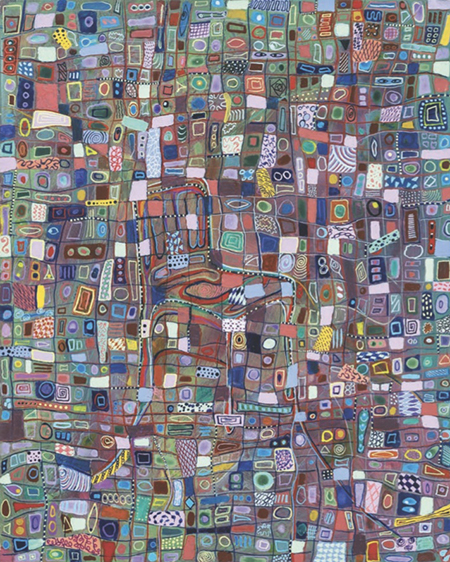 Robert Walker’s exhibition, titled “Rhebis,” is all color and motion, abstract work in a variety of mediums that pulls us into an exciting and often vibrant world. Exploring 15 years of Walker’s work, forms and images are contrived to reveal the interconnected nature of the world. Evoking Walker’s own practice of meditation, these are deeply interior works that invite contemplation. In “Asterisk,” a web-like composition of nylon netting, resin and pigment in silver, grey, and red all mesh. The material forms a circle within a square that calls to mind cell-forms and the building blocks of life. In the vividly colored “Vertnig,” ink, acrylic and enamel make up a series of wonderful oblongs, squares and rectangles that shine like jewels. Some works are spinning and kaleidoscopic expanding universes. Ribbons of color eked out from stacked, thick paint are the medium of “Good Radar.” Here, the carved acrylic on wood creates a dazzling, hypnotic image. “Captcha” is an even more dimensional work using the same technique; the image seems almost to move, and is very much alive. The precise nature of Walker’s lines and forms is difficult to nail down; the wonder of seeing turning into believing is part of the pleasure in this encompassing exhibition.
