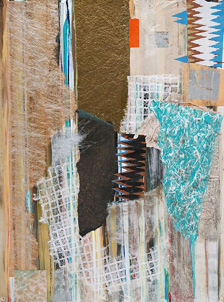Six years ago, Sandi Seltzer Bryant began a major transition in her work, moving from colorful abstract paintings to large collages incorporating layers of printed and textured papers. Bryant began collecting an array of distinctive papers that she encountered while traveling throughout Asia and Europe. These materials subsequently became the building blocks of her work, and the results are compelling. Some collages suggest figures, others still lifes, and many reference the landscape. For example, “Untitled 55” is a horizontal piece with a central shape suggesting a young girl in a skirt and bonnet running across the picture plane. Sheer paper embellished with leaf shapes can be interpreted as a strong wind pushing her into a forest of vertical stripes resembling tree trunks. Bryant does not title her pieces, preferring that viewers author their own interpretations. She also does not dictate top or bottom, encouraging her collectors to experiment in order to determine which orientation they prefer.