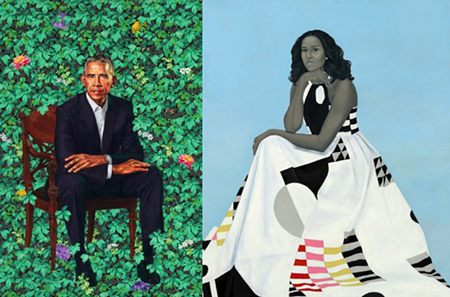 The unveiling of the portraits of the Obamas for the National Portrait Gallery — Barack Obama by Kehinde Wiley and Michelle Obama by Amy Sherald — elicited the expected reactions from various sectors of the electorate. Unstinting praise from liberals, in general, swayed by affection for our exemplary First Couple, with art-world approbation for the deviation from the old-fashioned stodginess that we associate with presidential portraits. While I share that affection for the Obama’s and appreciate their interest in supporting black artists, I can’t help but feel that the paintings do not accurately commemorate this historic administration. The styles are inappropriate.