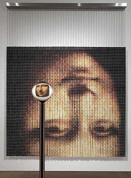 In a work such as “After Monet (Water Lilies) 2,” with its 4,560 spools tightly stacked against each other and stretching almost 9 feet, it’s an optical feat as to how slight variations in blue spools of thread yield a facsimile of the famous work through the oculus. A smaller work, “After da Vinci 1 (Self Portrait),” depends on a mere 442 spools, ranging from pale orange to yellow to dark brown. A different spin on the conceit is “After Holbein 1,” in which chenille stems are arranged seemingly at random around a stainless steel cylinder. Walk around the installation and Hans Holbein’s “The Ambassadors” emerges.