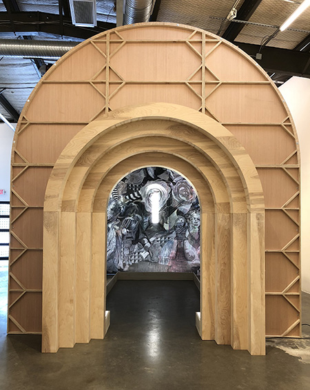 The fact that artists have painted murals on the walls of temples, churches and civic buildings is something about as old as art itself. It’s a history that inspired Francisco Moreno to spend two years on a single project titled “The Chapel,” a structure can be read as both a sculpture and as painting; and it’s the centerpiece of Moreno’s current exhibition. The project was made possible through partial funding by a micro-grant awarded to the artist in 2016 by the Nasher Sculpture Center. Moreno became fascinated by an installation at the Prado Museum, a recreation of the interior of the 12th century Hermitage of the Vera Cruz de Maderuelo. Architecturally classified as Romanesque, in it were installed the original murals that had been transferred onto canvas in 1947. This surprising find, combined with Moreno’s interest in the dynamics, illusion and intense light sources found in Baroque art, plus his interest in the tradition of Muralismo from the movement in his native Mexico, were the seeds that grew into this ambitious project.