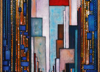 In his new exhibition of work from the past two years, Innerst clearly has not lost his touch. The small cityscape "Tiffany" expresses a sheer rapture for the electrifying vitality of New York City at night. This truly melodic composition expands upon an idea introduced in Piet Mondrian's iconic "Broadway Boogie Woogie" (1942-43), where a flat geometric grid conceptualizes the structure and energy of the Big Apple. In contrast to Mondrian's emphatic two-dimensionality, Innerst presents a radiant three-dimensional vision of floating geometric blocks flanked by bejeweled vertical strands of light that function like curtains opening onto a dazzling view into virtual reality. Also noteworthy are several monochromatic blue paintings of people moving through the underground pathways of the New York subway system. While their blue palette suggests photographic cyanotypes, these paintings effectively veer into narrative and metaphoric territory.  In “Underground Platform,” hoards of anonymous people are shown tightly amassed on a platform that moves along a curve from foreground to background. Sheathed in a blue atmospheric haze and intermittently spotlit, the scene is invitingly mysterious and memorably haunting.