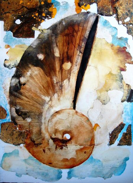 In his exhibition “Phenomena,” neoexpressionist painter David Geiser exploits the materiality of oil paint, varnishes, resins, gold leaf, and a panoply of other media, reveling in creamy, coagulated surfaces and nuggety clumps of powdered pigment. In works such as “Purple Totem 1” and “Rose Cenote,” sumptuous purples play off billowing ecru, suggesting clouds or nebulae. Not all the works in the show are abstract; many riff on motifs from the natural world: shells, chambered nautiluses, and rhinoceros horns.