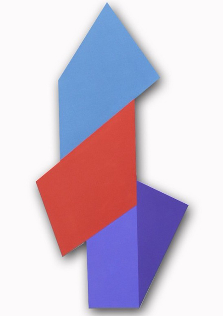 It is not as simple as suggesting there is a push-pull quality to Laget’s works, rather they challenge our perception with suggested movement in all directions. She playfully riffs on an array of influences, from Tetris-like puzzles, to architectonic constructions, to origami-evoking tessellations. The current series is a logical progression from earlier works, where the dynamic, if irregular, shapes seem arbitrarily cut short by the constraints of the traditional rectangular format. Equally enticing are the Algerian-born artist’s unpredictable color harmonies, blending tertiary with primary hues. This evokes the sophistication of Kenneth Noland and Karl Benjamin: cobalt blue meets lime green countered with tangerine, rust and murky teal. While the ever-shifting polygonal shapes of the canvases provide the initial impact, the overlapping forms and colors, alternately opaque and translucent, increase the illusionistic punch.