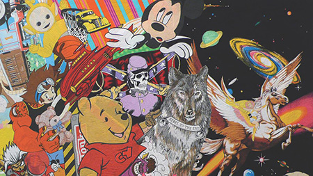 “Beyond Beyond” spans more than 15 years of the Tokyo-born artist’s career, revealing the evolution of both the subjects she explores and the fabrics she uses. Based in Brooklyn and Istanbul, Turkey, Kijima’s art practice has always centered around the fusing of found textiles, acquired from thrift stores, flea markets and bazaars since adolescence, into masterfully executed quilts. The exhibition includes early works created with bits and pieces of sheets, towels, curtains and clothing. For the show’s earliest work, a 2002 piece titled “Erehwon” (“nowhere” spelled in reverse), the artist used primarily images from nature, including animals and plants. Like Japan’s Superflat movement, which called out the homogeneity fueled by commercialism and internet culture, Kijima pricks at the perils of commodification.