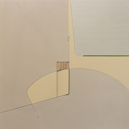 Most of the pieces in “Hylê Forever” are contained within a square or rectangular space, but they have a three dimensional quality. Using fine woods, resins, and materials of his own creation, the subtle curves and swells reveal hidden pops of color and tiny microcosms of geometric shapes. Other works are composed of multiple thin wooden vertical elements which are organized into formal unity. Connected by Pierme’s use of earth tones and soft pastels, the wooden slabs curve and bend to create a unique form when viewed at every angle. This body of work possesses a geological quality, as if they were produced by the earth millenia ago, the result of time and compression.
