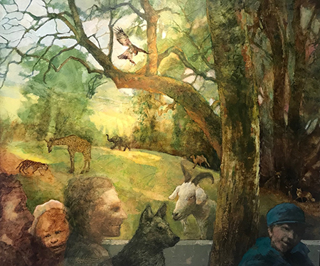 One of the larger works, “The Verandah” suggests that animals and humans are on equal footing, with its expansive hillside scene showing a roving giraffe, elephant, tiger, camel and goat in coexistence, while lower in the painting a mix of individuals view the animals from the verandah of the title. The potential for harmonious relationships is even more apparent in “Waiting for the Train.” A clown dressed in white — perhaps a circus clown — sits with his shoulders drooped, his back to a table around which jungle and forest animals are nonchalantly waiting. Under the table, an alligator teases a lion. In the background, a woman in blue reaches for a stork. Despite the puzzling arrangement of people and animals, the scene connotes peaceful interaction.