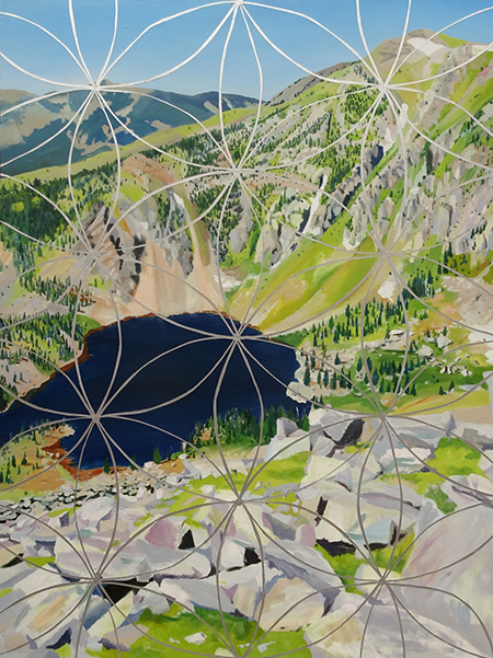 Matthew Mullins’ exhibition, titled “The Sun in our Bones,” is inspired by his connection to the New Mexico landscape. The collection of paintings, photographs and sculpture is unified by its exploration of the patterns and textures of the natural world. Though his subject often starts with the earth, he expands these themes by incorporating mandala-like geometrical design, and cosmic depictions of night skies. As the artist states, “I wanted to paint nature and natural process from the subatomic world to the stars.”