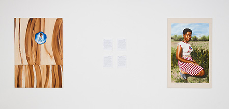 Mokgosi exchanges those large multi-panel narratives in favor of smaller paintings depicting printed posters and advertisements, cropped scenes of interior spaces, and isolated figures. While his focus is on how African bodies and culture have been depicted and described over time, in this installation he investigates these subjects through the lens of still life — specifically looking at how African objects have been positioned in his own paintings. What sets Mokgosi's work apart is its intellectual intent combined with seductive imagery. For example, in “Object of Desire 6” he juxtaposes a painting of closely cropped wood grain onto which he has superimposed a small  circular shape depicting a young white child praying. This is set against a second canvas painted with a snapshot of an African woman kneeling in the landscape, her body in a position that parallels the praying boy. Between these two canvases are four texts (paper mounted on board) covered with Mokgosi's handwritten annotations over art historical texts that reference Picasso, Gauguin and Max Ernst, and purport to explain the relationship between modern and tribal art.