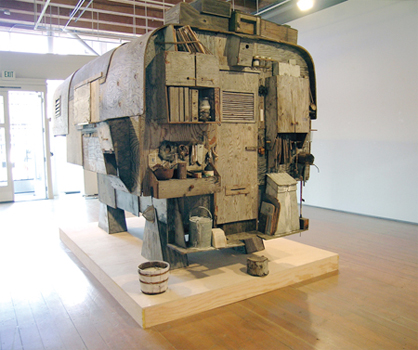 Bovine, a 14-foot long anthropomorphic sculpture, was inspired by an abandoned piggyback camper glimpsed on a humble plot of land in Twisp, Washington. Tennis exhibited his mammoth plywood structure at Greg Kucera before seeing it moved to the gallery's exterior balcony where it suffered the Northwest's wind and rains, in time taking on a decidedly more rugged appearance. Tennis deemed Bovine's weathering a necessary component of the piece, which eventually entered the permanent collection of the Seattle Art Museum.