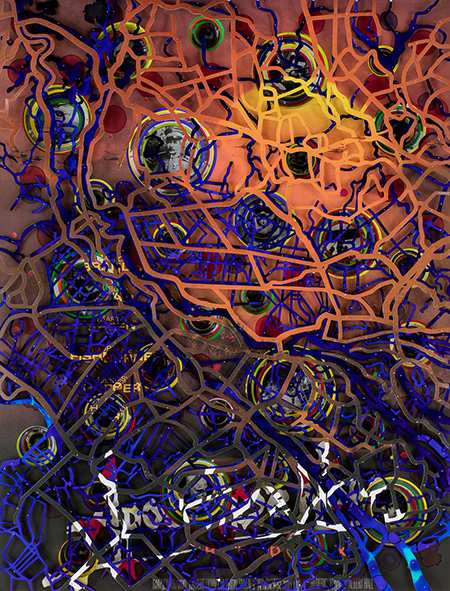History, geopolitics, cartography and sculpture meet in the work of U.K.-born, Ashland, Oregon-based artist Matthew Picton. Picton came to the visual arts via the unusual avenue of an economics degree at the London School of Economics and Political Science. He became a full-time artist at the relatively late age of 38. His art-making’s anthropological focus is very much in evidence in “Cultural Mapping.” In a suite of wall sculptures, Picton layers the contours of cities, roads and river systems in dense super-impositions that weave temporal narratives of how human beings change landscapes and cityscapes to meet their needs, whims and lust for power.
