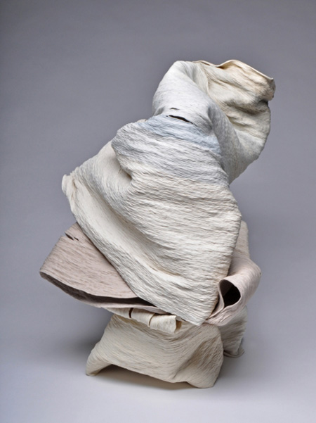“Litany of Failures” is an apt title for a ceramics exhibit when you consider the risk-taking involved not only in building clay sculptures, but also in trusting them to the fires of the kiln. The occasional deformed and shattered pieces are inevitable. Cheryl Ann Thomas is philosophical about the risks, seeing “failure” as a relative term if, in the end, her abstract ceramic pieces can serve as metaphors for life’s uncertainties. With that in mind, Thomas’ practice centers on coil construction using ultra-thin segments of porcelain clay from which she fashions columns and other shapes. During firing, if the shapes slump or collapse from being too thin or too tall, Thomas is content with having learned something from the experimentation. The pieces might stay as is, or she might enfold them into other “failed” pieces and return them to the kiln. In either case, the results are pleasingly multifaceted and have the ability to engage viewers in a number of ways.
