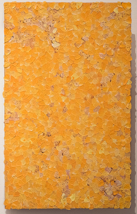 Tom Marioni, "The Golden Wing," 1988, butterfly wings collaged on wood panel, mixed media relief, 33 3/4 x 21 3/16 x 2 1/2". Courtesy of the Fine Arts Museums of San Francisco