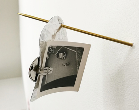 Laura Davis, "Password," 2018, knitting needles, aluminum, earring, found photo, 6 x 4 x 4". Photo by Robin Dluzen
