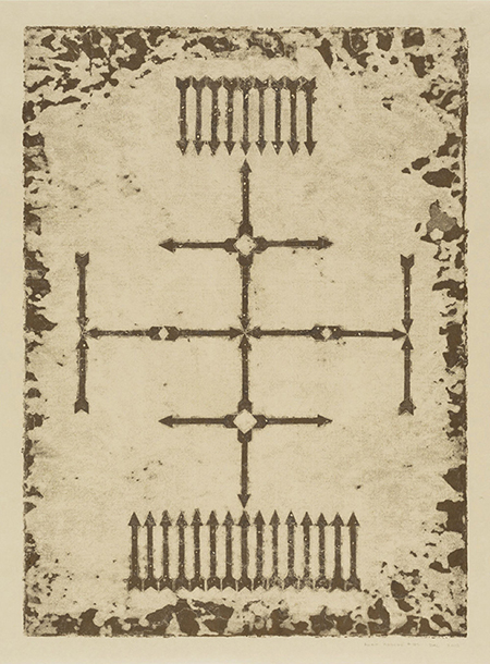 Carried throughout David A. Clark’s work is the motif of the arrow. Representing time, movement, and direction — for Clark, the arrow is an important and universal symbol of humanity. He works with encaustic, a painting medium using pigment with hot wax, on beautiful Japanese paper and calfskin that give the pieces a unique textural quality. Combined with his use of earth tones, the totality conveys an organic and primal quality, like patterns on the wall of a cave. The graphic nature of the arrow produces dynamic and energetic movement and pattern, and being one of the most universal and ancient of symbols, its repetition in the work hints at grander themes. While the arrow could be a seen as a weapon, Clark arranges them into circular, starry patterns that highlight its representation of direction and movement, rather than violence.