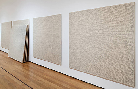 Text-based art can often be tedious to experience. When used in an installation format that presents rows and rows of written information intended to be read word for word, for example, it can be nearly impossible to decipher meaning because, literally, there is "too much information." Walking through an art exhibition is physically and structurally different from reading a book. Logistically, a presentation of small fonts in large masses across gallery walls can counterproductively inhibit our abilities to perceive form and content.