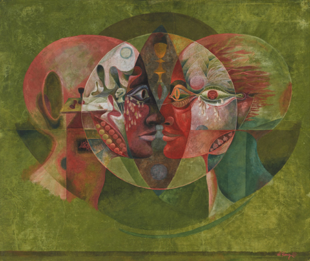 Kenney, the youngest of the group, developed mostly after World War II. His meticulous tempera abstractions of mandala shapes can now be seen as transitional paintings from Gay Art (symbolic, indirect sexuality) to Queer Art. Remarkably fusing modernist abstraction with a sexually charged symbolism, "Seeker: To David Stacton" (1968) is a vertical geometric composition that reads as a full-frontal view of a male figure, complete with navel and phallus. Influenced by Surrealism and the gay Neo-Romantic artists Pavel Tchelichew and Eugene Berman, "Sleeping Seed" (1966) suggests sperm swimming on a pale lavender and blue ground. More explicit, "Voyage for Two" (1953) affirms Kenney's aesthetic of submerged erotic symbolism. Two heads are seen in profile touching noses. His art was the subject of a retrospective at the Museum of Northwest Art in 2000. The catalogue essay by art critic Sheila Farr avoids deep analysis other than one reference to "abstracted sexuality."