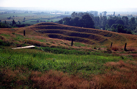 Subsequently, a catastrophic landslide occurred on one side of Morris’ project, leading to its first restoration. His initial fee was $80,000 for the design of the inverted spiral jetty which descending to a void at the base, selecting and planting rye grass, and allotting space for a bronze plaque. In 1994-97, he was paid another $98,000, this time to oversee new plantings of blooming ground cover, arrange for the bronzing of the formerly tarred tree stumps, and hire a herd of goats to mow the lawn (shades of an early Oppenheim piece with sheep). Since then, $10,000 is allocated annually for upkeep. So much for the aesthetic of entropy and decay Morris lifted from Smithson and that he had once touted.