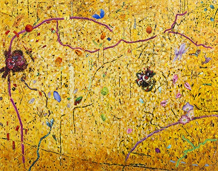 Nature is alive with movement, from the rhythms of microscopic organisms to the dance of shifting clouds. The world is at play here, with two artists whose passion for the kinetic pulse of nature takes two very different forms. Jim Waid creates painterly works that border between abstraction and landscape. Layered with color, texture, and his own whimsical mark, they exude the joy inherent in the natural world in its purest form. It’s a strong contrast to more polemical artists who focus on the ways nature has been neglected or assaulted by human endeavors. Waid provides a subtler cautionary tale, calling to mind the rich complexity of organic form and color, freed from human subjugation. We see a mix of forms both familiar and mysterious, as Waid channels the paradoxical relationship to our surroundings in which much is taken for granted yet much remains unknown. Six of the nine works shown here are acrylic on canvas paintings created from 2017 to 2019. Also included are two mixed media on paper pieces and a pastel on paper work, all done this year. Most intriguing is “Jabberwocky,” in which branch-like lines in a sea of yellow dots and scratches seem to bend at once both toward and away from one another.