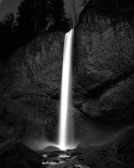 In “Waterfalls,” five large prints from his “Rivers and Falls” series, the photographer presents, in living black and gray, time exposures of cataracts, blurred by motion, and framed by shadowy cliffs; the scenes are thus deprived of specificity and generalized into enigmas. Katseff’s pictorialist approach, far from the immediacy and sharp focus championed by Adams and his f/64 cohort, is introspective and poetic, although the locations he shoots may already be familiar to photo fanciers from earlier works by Adams, Carleton Watkins, and other documentarians and mythmakers of the American West. Katseff’s ghostly waterfalls, diffuse and frozen, like liquid smoke (not the barbecue sauce) become metaphors for infinity, or maybe the elusiveness of reality. So do his opposite-but-equal, featureless studies of specific interiors, white and pale gray, taken from scale models made of pristine foam core. Says Katseff, “The outline of the image is easy to see, and as with memory, our imagination must supply the rest.”