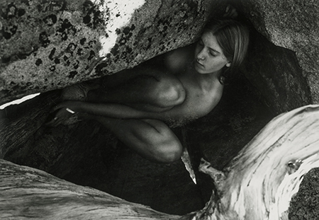 The exhibition opens with life-size photographic reproductions of the windows and paper-strewn floor of Woodman’s loft, then plunges into the diverse subjects and settings that she pursued. Woodman often employed a tripod to insert herself into the compositions, primarily using a medium-format camera. The prints run six-by-six inches or slightly larger. One of the most intriguing series is one in which Woodman tries various nude poses while pressing against a large mirror or glass plate. In one series she squeezes herself into the crevice of a large tree trunk, reflecting perhaps a merging with nature or a retreat into it. Another series places her in a cemetery, wearing only a light shawl. There’s an unexpectedly lovely and intimate photo in which the back of her lace-covered torso is juxtaposed against a lace-covered stone cross.