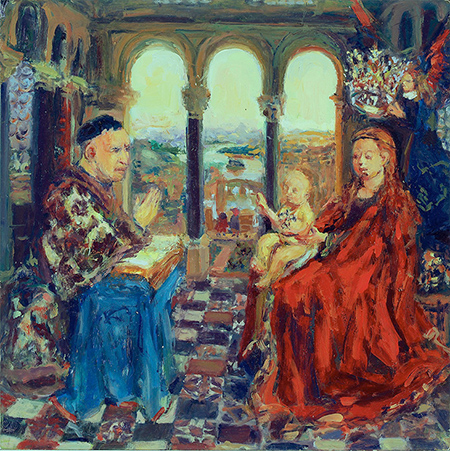 After Adelman was educated at Carnegie Mellon University and University of Washington, she assumed teaching positions at Louisiana State University (2001-2002) and Dickinson College (2003-2004), before accepting a visiting lecturer position at the University of Washington in 2008. Rejecting abstraction, Adelman earlier spent time in Washington, D.C. as advertising director of “Museum and Arts” magazine before the teaching jobs and move to Seattle. During her stay in the nation’s capital, Adelman absorbed Old Masters at the National Gallery of Art, Smithsonian American Art Museum, and the Phillips Collection, where she also worked as an educator. These experiences turned her toward portraiture. She began a series upon her arrival in Seattle, as well as curious re-interpretations of canvases by a diverse range of masters, such as Van Eyck (“Madonna of the Chancellor Rolin,” 2010), Watteau (“Pierrot, 2010”) and, recently, Lucian Freud.
