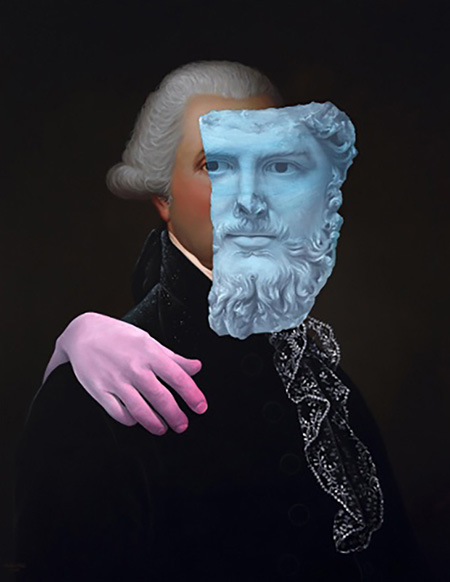 “Fool’s Errand.” Huckins’ newest series, goes on view at K Contemporary in Denver this month under pandemic-era rules of timed entry that play right into the artist’s hands. Huckins continues his caustic tone by letting the re-created classical portraiture give way to depictions of shards from classical Roman sculpture. Primed, you can feel the collapse of a society and its fall from grace in these images. Ghostly, disembodied hands placed on the subjects suggest sinister manipulations, symbolizing the corrosion of the country’s venerated past. In “(Samuel Verplanck)” the original by Copley is reimagined with a pink mask that appropriates the eyes of a Roman statue and with a floating white hand that grasps the man’s shoulder. The message is that chaos and dysfunction, far from arriving unexpectedly were always just biding their time.