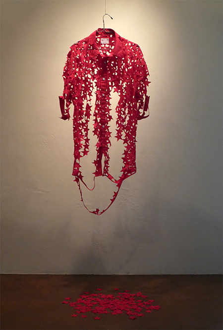 Ann Morton, “Losing Our Shirt.” 2009, hand-cut found food worker's shirt, 18 x 36" plus floor arrangement. Courtesy of the artist