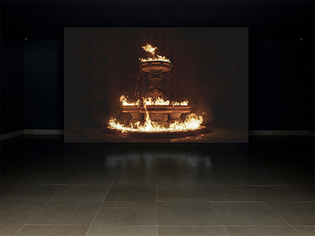 At the entrance, “And Beneath It All Flows Liquid Fire” (2019) fills several square meters of space, nearly floor to ceiling, to animate a darkened gallery. It’s nighttime and we see a fountain in a Lugano, Switzerland square that’s engulfed in flames as water simultaneously pours forth along its structure. It serves as a meditation on opposites like light and shadow, or fire and water, that suggest the power to create and purify, as well as to destroy. On a continuous loop, the projection includes the bellowing sounds of the elements at play that, taken together in a writhing rhythm, both fascinate and mesmerize. This juxtaposition of wild elements and what the viewer normally experiences as a quiet city square suggests more than a hint of danger as one ponders what’s at stake when we misuse technology.
