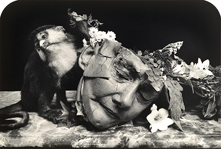 Piercing eyes revealed through two almond-shaped holes in a black mask beckon viewers to come closer in a self-portrait by Joel-Peter Witkin. A white crucifix set between the eyes hints at the artist’s fixation on dualities: darkness and light, permanent and temporary, normal and abnormal, vulnerable and protected, internal and external, attraction and repulsion. The gelatin silver print (“Self Portrait,” 1984) hangs just beyond the first gallery space one encounters, as if the artist himself is a voyeur watching the ways people react to his works or rewarding those who seek out the rarest visual and existential landscapes. Masks recur in Witkin’s oeuvre, where they poignantly channel emotional defenses meant to conceal vulnerability.