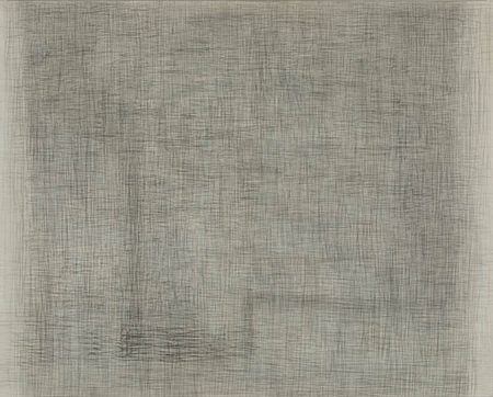 Robin Kandel’s current exhibition, with its intriguingly enigmatic title, “It Was a Place Beyond Compare with a Magnetism Like No Other,” shows the artist paring down her means and working spontaneously. Kandel is known for densely worked abstractions composed of ruled parallel stripes that reference landscapes, journeys, and memory: large unstretched canvases, hung by grommets and crisscrossed by folds, like glove-compartment maps; paintings on panels traversed by angled stripes that suggest lacustrine rippling waves; and square-foot drawings suggestive of graphite-embossed topographies. Here, the artist limits herself to a nostalgia-charged Dixon Ticonderoga No. 2 pencil and prepared panel and paper (coated with and acrylic ground that simulates the texture of drawing paper). Paul Klee said, “A line is a dot that went for a walk,” and ”A drawing is simply a line going for a walk.” Kandel’s unconstrained pencil, “wandering the streets of old local maps and across scraps of earlier drawings,” creates psychic maps that inquire about directions, “So, where is this place and how do we get there?“ Gauguin, meet the Talking Heads (“Once in a Lifetime”).