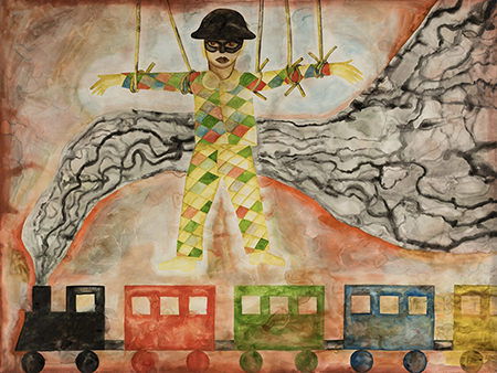 While self-portraits like “Summer Self IV” and “Summer Self V” (2011) and the 1998 portraits of “Fran Lebowitz” and “Toni Morrison” are examples of Clemente's skill in capturing the personality and likeness of his subject, recent large-scale (60 by 80 inches) watercolors on paper like “Rising,” “Victory” and “Harlequin in Love” (all 2021) illustrate the quirkiness and depth of his imagination. In “Harlequin in Love,” a childlike rendition of a choo-choo train with black, red, green, blue and yellow cars traverses the bottom of the composition, while a black engine blows a billowing cloud of gray smoke across the middle. A masked harlequin with outstretched arms hangs from five ropes that extend down from the top of the painting, as if being lowered onto the train. In this dreamlike image, Clemente captures the comic / tragic dualities inherent in the harlequin subject. “Victory” centers attention on a galloping racehorse with five legs darting across the bottom half of the paper beneath a light pink feather-shaped cloud. As in so many of Clemente's other works, this is a fantastical image of an exaggerated reality.