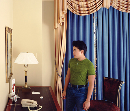 During the 1970s and ‘80s, Wall earned considerable acclaim for his pioneering backlit photography. He mounted large photographic transparencies over light boxes to bring a cinematic quality to his imagery. In his more recent digital prints, it is photographed light that plays a pivotal role in establishing a mood and directing our attention to or obscuring it from activities within a composition. In “Man at mirror,” for example, a table lamp illuminates a mirror with writing that we cannot read because it faces at nearly a right angle within the composition. But it is the focus of a young man staring at it.