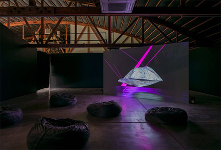 Following in this direct lineage, “PEAKING” advances Silva’s syntax and themes, expanding them to a scale literally unprecedented in his output; this is physically the largest installation he has undertaken to date. Scored to electronic music of his own composition, the 25-minute video projection begins in earnest on an immense screen in the soaring main gallery, with its cathedral-like vaulted ceiling and crisscrossing support beams. The darkened room is appointed with five beanbags for viewers to recline upon as they take in the images and the uncanny ambiance. In a half-dozen distinct sections, computer-generated mountains slowly revolve, enveloped by inky blackness, shot through with periodic laser beams, the frequency of light-play and background effects gradually growing more complex and frenetic. Essentially, the sequence progresses from largo to allegro agitato to prestissimo and is apt to induce a mélange of vertigo and anxiety, comfy beanbags notwithstanding.