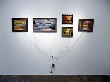 Two worlds collide in Allison Wiese’s alterations of Robert Wood’s landscapes, painted in the mid-twentieth century and well-represented in reproductions on motel and living-room walls. Wood portrays an unspoiled nature--the powerful ocean, the pristine forest, the meandering river. Even the occasional rustic farm building or bridge doesn’t disturb the peace and harmony of these rural scenes. Enter Wiese. With the insertion of one or two blinking LED lights and a battery pack on each Wood print and additional wire leading to a transformer and wall plug, this serenity is ripped apart. She drags these scenes into the twenty-first century, where even these tiny LEDs, on our battery rechargers, surge protectors and appliances, because they are constantly on, threaten the continued existence of the natural world not just as we’d like to believe it is, as in Wood’s portrayals, but as it really is as well.