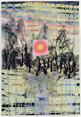 Paper collage, photo transfer and paint