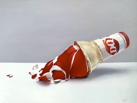 Gina Minichino paints a very modern subject: junk food, but her paintings are heavily influenced by Dutch and Flemish masters’ use of light and composition. Similarly, Minichino draws on the 17th Century Dutch still life tradition, which depicted food in a way that almost reified it in sumptuous stillness. Minichino’s work has a subdued, almost gothic sense of isolation despite its subject matter which convey a simultaneous sense of both exuberance and loneliness.