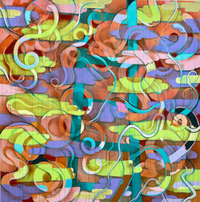 NOW and AND THEN features Strasen’s newest paintings paired with earlier works, illuminating the continuity of her layering practice through deep shifts of medium and subject. Tightly bound by an internal compositional logic, the paintings invite the viewer to dig deeper and unearth a multitude of possibilities and burgeoning ideas about the self and the culture(s) we inhabit.